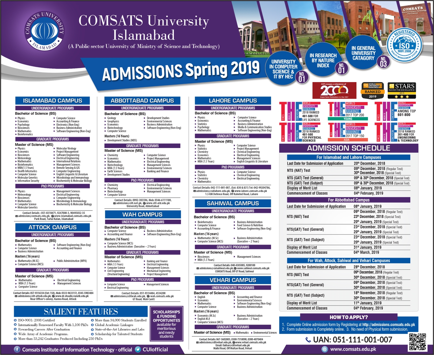 Islamabad, COMSATS University Islamabad has started the admission process for the COMSATS BS & MS spring semester 2019 and the students note that the last date for the submission of the application forms for Lahore and Islamabad campuses is 20-12-2018 and the NTS tests will be conducted on 09-12-2018 and 30-12-2018. COMSATS University admission spring 2019 first merit list will be displayed on 08-1-2019 and the classes will be started from 04-2-2019. The candidates will have to complete the documents online. The candidates of Abbottabad, Wah, Attock, Sahiwal and Vehari campuses will follow their own schedules online for grant of admissions in COMSATS BS & MS admissions 2019 for spring semester.