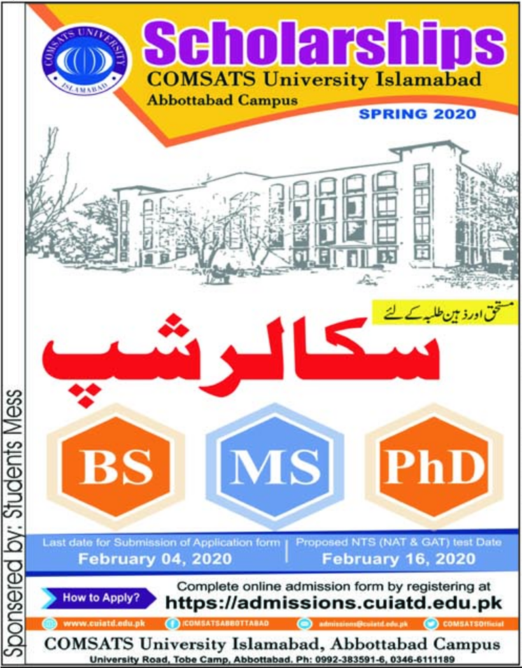 Comsats University Islamabad is seeking applications for Scholarship against BS Degree, MS Degree and PhD Degree in Comsats Abbottabad Campus. Scholarship 2020 for Intelligent and Deserving Students.
