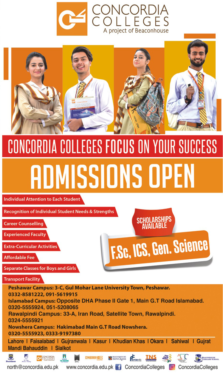 CONCORDIA College Quetta has announced admissions in FSc, ICS and General Science Subjects in Peshawar.