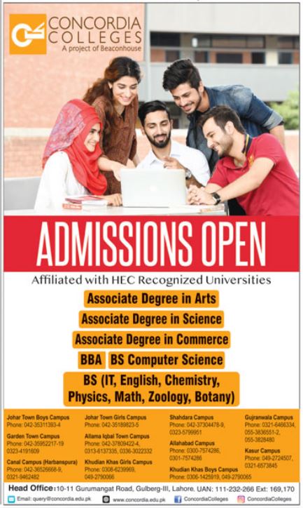 Concordia Colleges Lahore has announced admissions for BS in Computer science, Information Technology, English, Physics, Chemistry, Zoology, Botany, Mathematics, BBA.