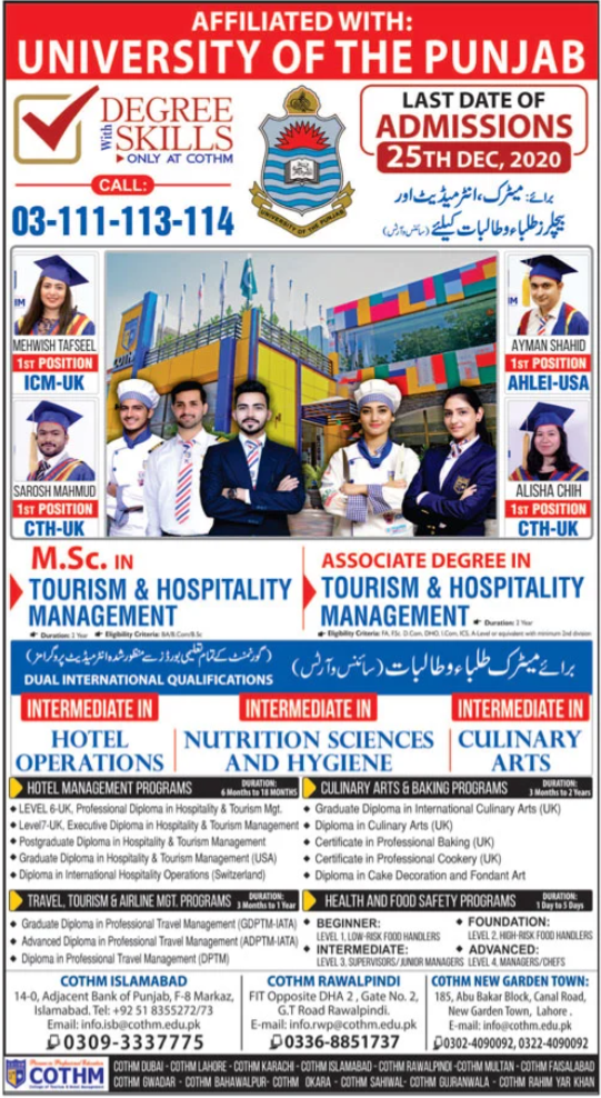 Cothm Lahore has offering admissions for Associate Degree in Tourism and Hospitality Management, Hotel Management Course, Culinary Arts and Baking Courses, Travel, Tourism and Airline MGT Courses. Intermediate in Hotel Operations, Nutrition Sciences and Hygiene, Culinary Arts, MSc in Tourism & Hospitality Management. Admissions are open.