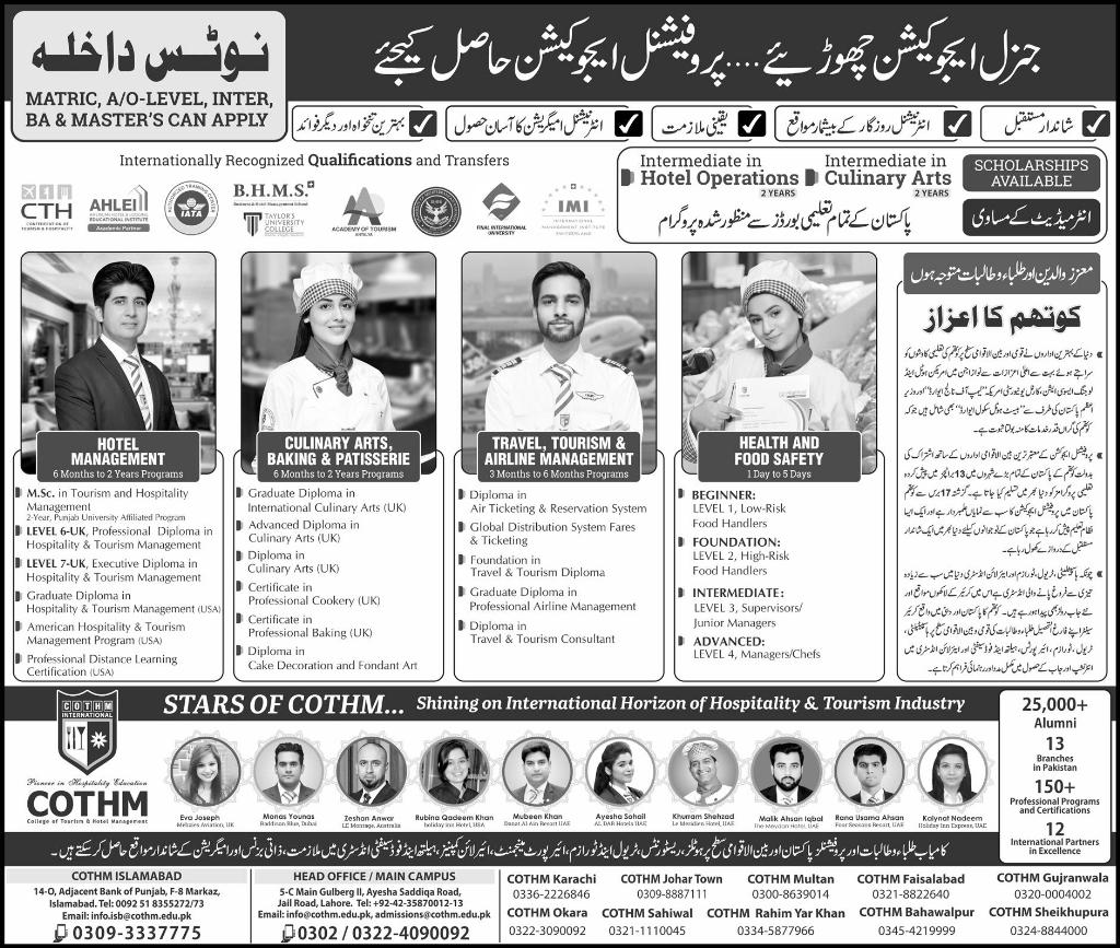 COTHM College of Tourism & Hotel Management announce admission in Matric, A/O-Level, BA & Masters can apply. Equal to intermediate . Scholarships Available .