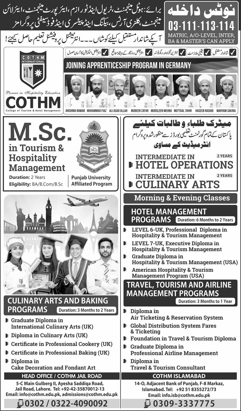COTHM College of Tourism & Hotel Management Lahore has announced admission for Hotel Management, Culinary Arts, Baking & Patisserie, Travel, Tourism & Airline Management, Health & Food safety, MSc in Tourism & Hospitality Management. For BA, B.Com students.