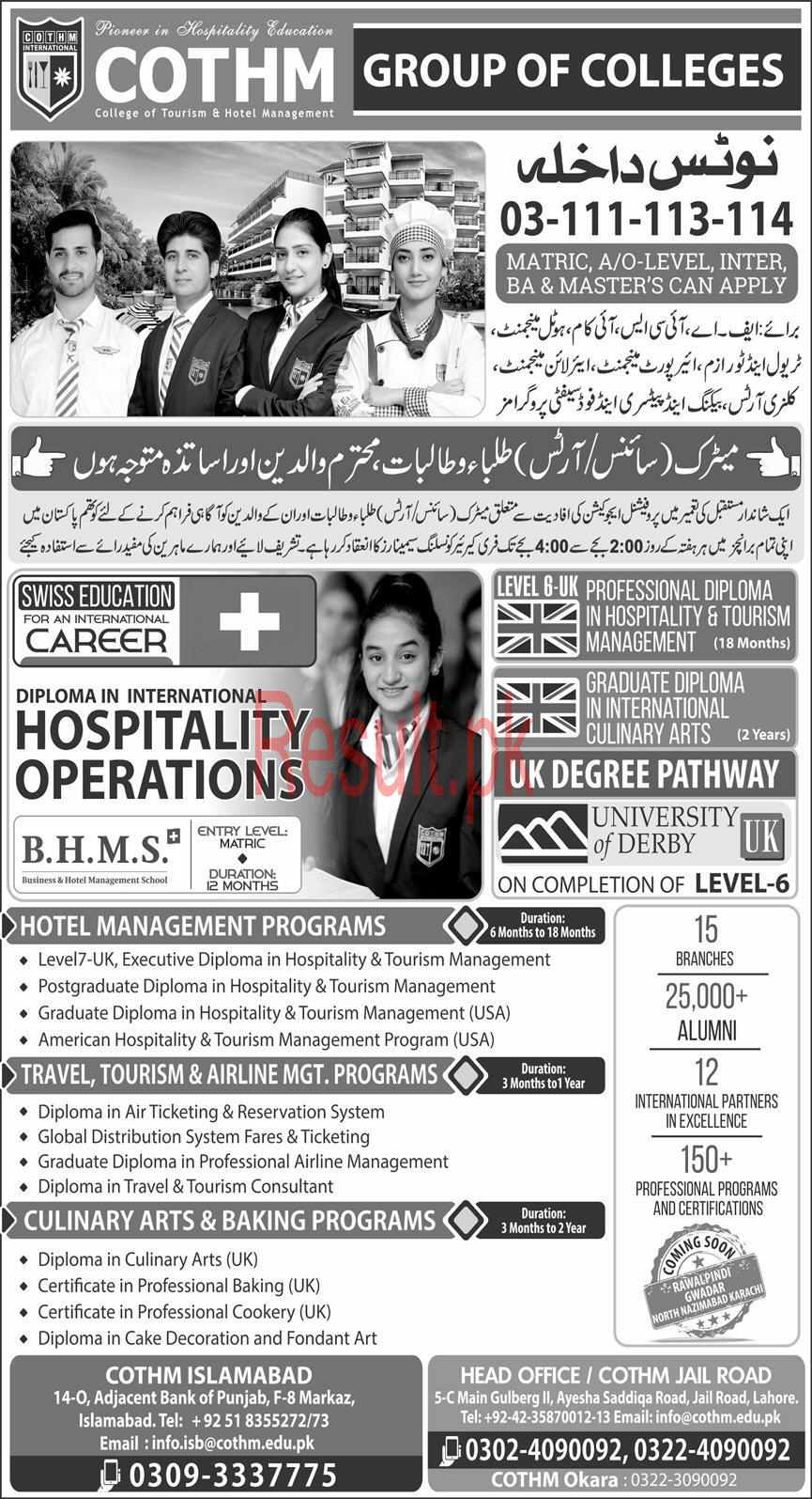 COTHM Group of Colleges has announced admissions for session 2020. COTHM offered admission for FA, Fsc, ICS, I.com, Hotel Management, Travel and tourism, Airport management and many others. Interested candidate may apply in COTHM for admission 2020.