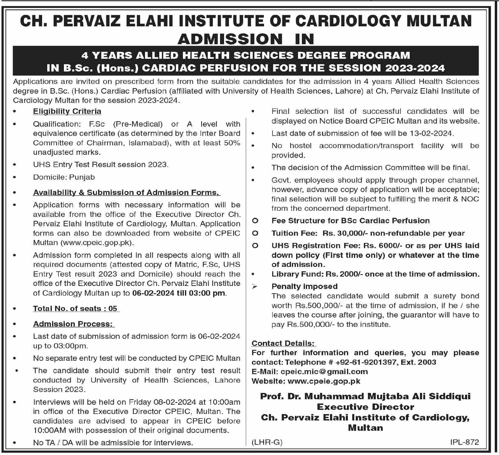 The Ch. Pervaiz Elahi Institute of Cardiology CPEIC in Multan is offering an exciting opportunity for aspiring healthcare professionals with the launch of admissions for the 2023-2024 session. The focus is on the 4-year Allied Health Sciences degree program in B.Sc. Hons. Cardiac Perfusion, affiliated with the University of Health Sciences, Lahore.