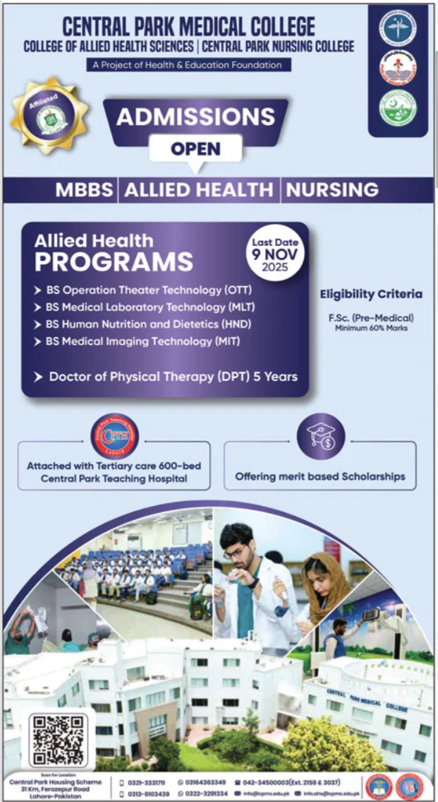 The Central Park Medical College CPMC proudly announces Admissions Open for 2025 in MBBS, Allied Health Sciences, and Nursing programs. Renowned for its academic excellence and advanced clinical training, CPMC offers students a dynamic learning environment under the supervision of highly qualified faculty, supported by a state-of-the-art 600-bedded Central Park Teaching Hospital.