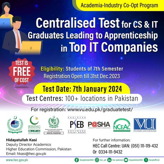 Virtual University is going to conduct the centralized test for the candidates of Computer Science and Information Technology, who are seeking apprenticeship training in various top IT companies in Pakistan. The candidates can get the detailed information of CS & IT Graduates Centralised Test 2023 Apprenticeship in Top IT Companies. For the registration for the test, the candidates can visit the official website of VU and after completing their registration, they can appear in the centralized test, which is free of cost and offered by Virtual University.
