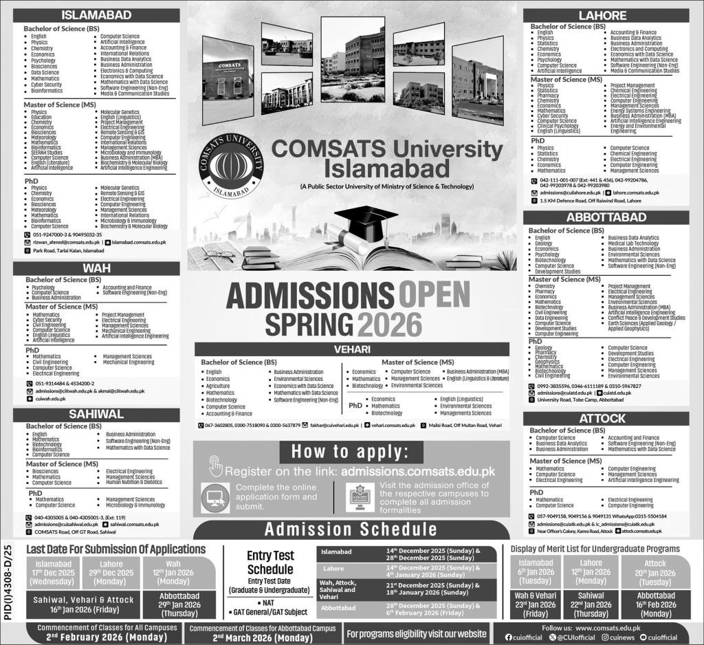 COMSATS University Islamabad CUI, one of Pakistan’s leading higher education institutions, announces Admissions for Spring 2026 across all its campuses, offering a wide range of undergraduate, graduate, and doctoral programs in science, technology, engineering, management, and social sciences.