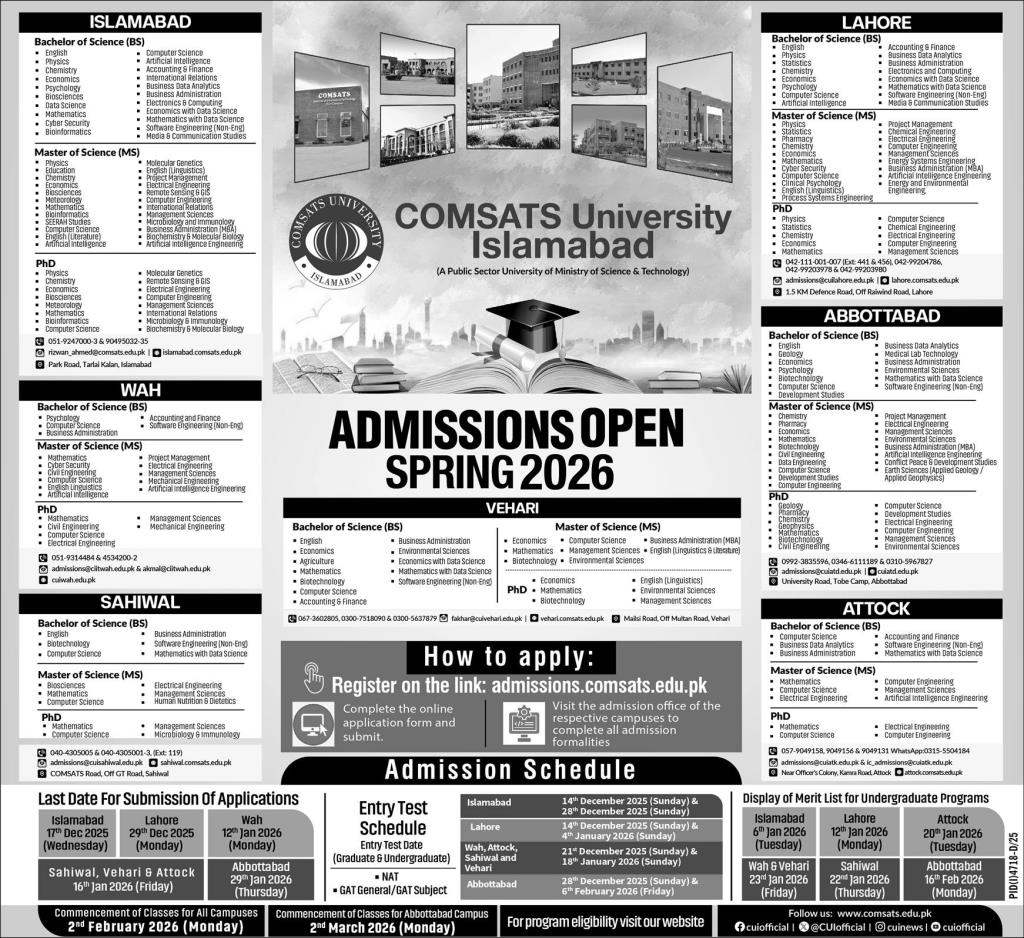 COMSATS University Islamabad CUI, a premier public sector university under the Ministry of Science & Technology, is inviting applications for its undergraduate BS, postgraduate MS/MBA, and PhD programs across its campuses in Islamabad, Lahore, Wah, Sahiwal, Vehari, Abbottabad, and Attock for the Spring 2026 session.