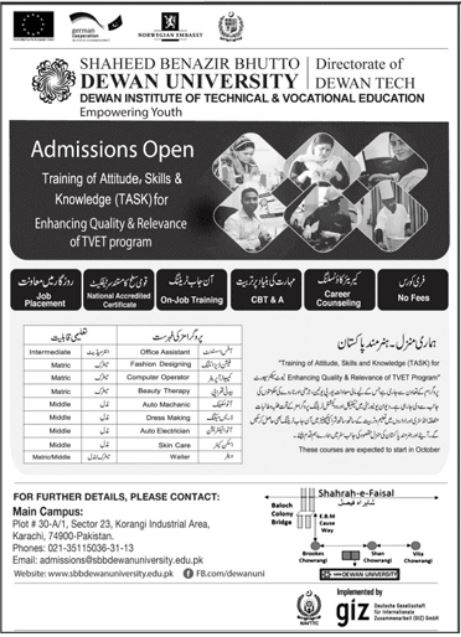 Dewan Institute of Technical & Vocational Education Karachi has offered admissions for Free Short Courses in Office assistant, Beauty Therapy, Fashion Designing, Auto Mechanic, Dress Making, Auto Electrician, Waiter. All Courses are Free of cost.