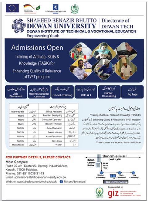 Dewan Institute of Technical & Vocational Education Karachi has offered admissions for Free Short Courses in Office assistant, Beauty Therapy, Fashion Designing, Auto Mechanic, Dress Making, Auto Electrician, Waiter. All Courses are Free of cost.