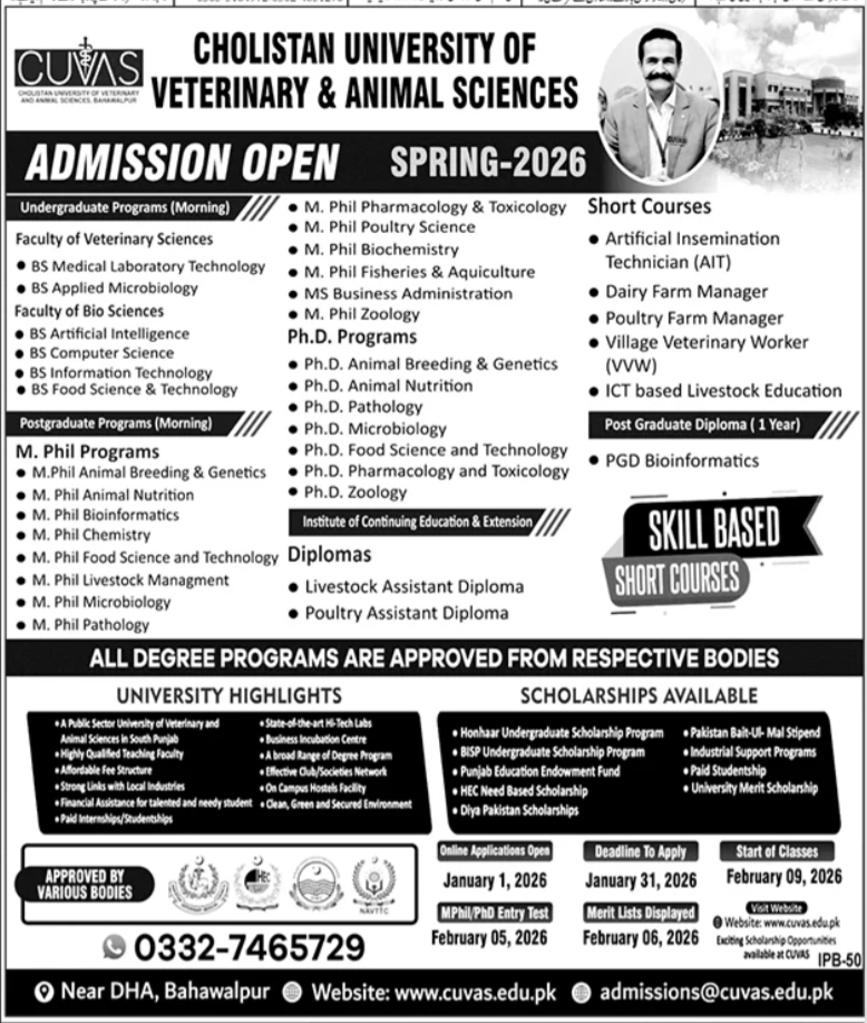 The academic landscape in South Punjab receives a significant boost as the Cholistan University of Veterinary & Animal Sciences officially opens its CUVAS Admissions 2026 portal. As a premier public sector university, the institution is inviting applications for a diverse range of undergraduate, postgraduate, and doctoral programs designed to meet the evolving needs of the veterinary and bio-sciences industries.