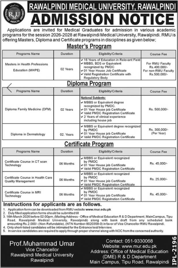 Rawalpindi Medical University has officially released its admission notice for the 2026-2028 academic session, inviting medical graduates to pursue advanced Master’s, Diploma, and Certificate programs. This announcement marks a significant opportunity for healthcare professionals to enhance their clinical and administrative expertise at one of Punjabs premier medical institutions.