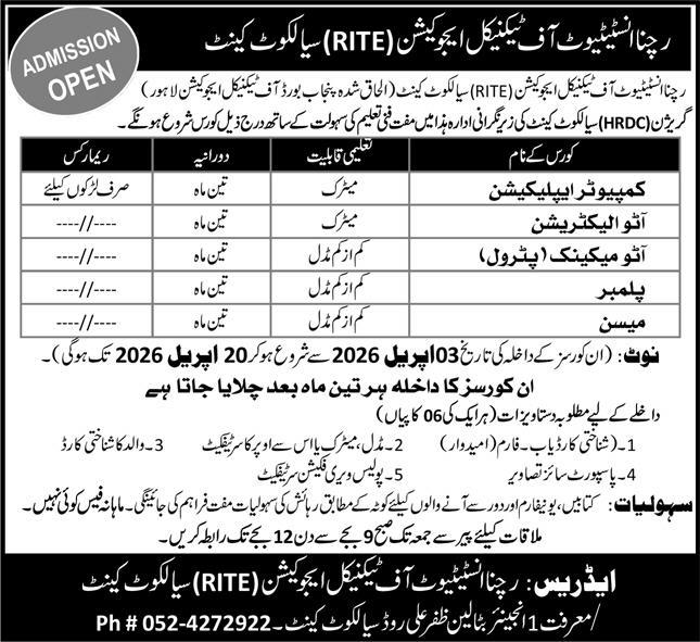 •Computer Applications & Auto Electrician: Minimum qualification Matric