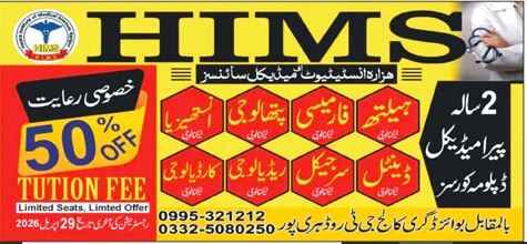 For further inquiries, candidates can visit the campus located opposite Boys Degree College, G.T. Road, Haripur, or HIMS Apply Online to secure their registration.