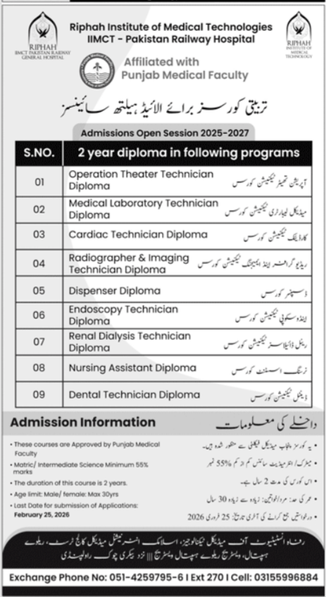 The RIMT provides students with clinical exposure at the Pakistan Railways Hospital, ensuring that graduates are well-prepared for the healthcare industry. A key focus of this years intake is the BS Medical Lab Technology and other specialized diploma tracks.