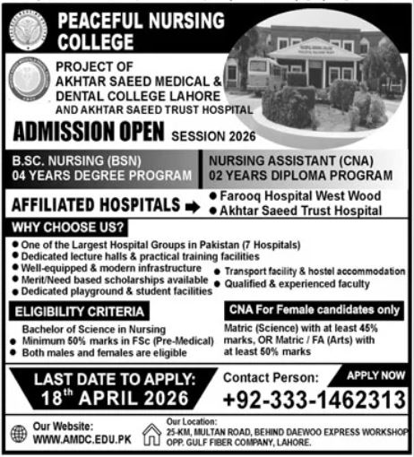 Peaceful Nursing College offers a strong foundation for students aiming to enter the medical and healthcare profession. With modern training facilities and experienced faculty, it provides an excellent learning environment for future nurses and healthcare professionals. Applicants are encouraged to submit their forms before the deadline.