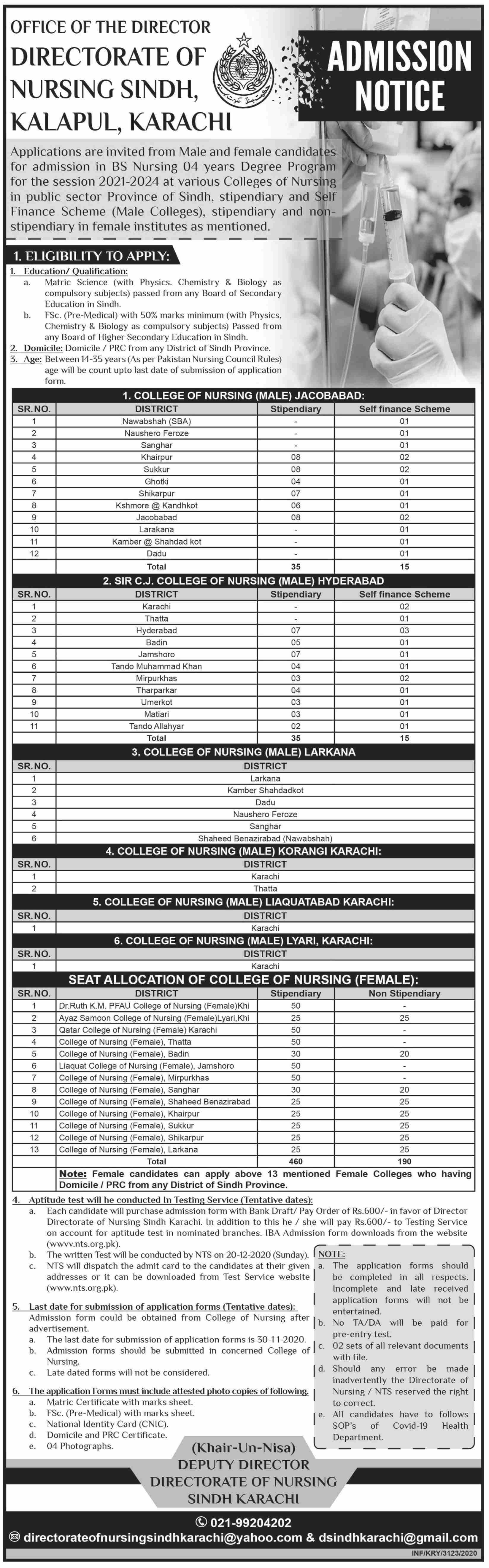 Office of the Director, Directorate of Nursing Sindh, Kalapul, Karachi has announced the admissions for Bachelor in Nursing 4 years program for Male and Female candidates in Karachi and other cities of Sindh. The last date for submission of application forms is 30 November 2020.