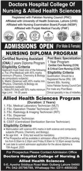 Looking to pursue a career in healthcare? Apply now for the Doctors Hospital College of Nursing and Allied Health Sciences Admissions 2023! With an admission last date of 15th August 2023, seize this opportunity to join a reputable institution dedicated to producing skilled healthcare professionals.
