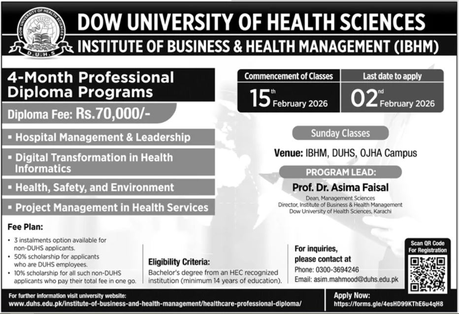 The Dow University of Health Sciences remains at the forefront of medical education in Pakistan. By offering these specialized diplomas through IBHM, the university addresses the growing need for skilled administrators and informatics specialists within the healthcare sector. The programs are led by Prof. Dr. Asima Faisal, Dean of Management Sciences, ensuring an authoritative and industry-relevant educational experience.