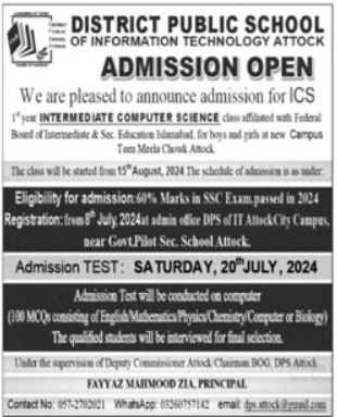 The District Public School of Information Technology DPSIT is excited to announce DPSIT Admissions Open for 2024. This year, DPSIT is offering admissions for the ICS program, designed to provide students with a strong foundation in information technology and computer science.
