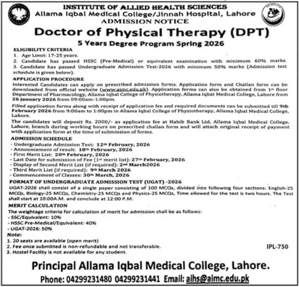 The Institute of Allied Health Sciences at Allama Iqbal Medical College AIMC, in conjunction with Jinnah Hospital, Lahore, has officially released its admission notice for the Doctor of Physical Therapy DPT 5-year degree program for the Spring 2026 session. This announcement marks a significant opportunity for aspiring healthcare professionals to join one of Punjab’s most prestigious medical institutions. For those looking to secure a seat, AIMC Admissions 2026 provides a structured pathway into the evolving field of physiotherapy.