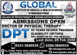 Global Institute of Medical & Health Sciences GIMHS, a leading institution in Sindh, has officially announced its GIMHS admissions 2026 for the College of Physiotherapy & Rehabilitation Sciences. As the demand for specialized healthcare professionals continues to rise, the institute aims to bridge the gap by producing skilled practitioners through its flagship Doctor of Physical Therapy program.