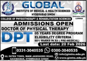The cornerstone of this years announcement is the highly acclaimed Doctor of Physical Therapy DPT program. This comprehensive 5 Years Degree Program is designed to provide students with both theoretical knowledge and practical clinical experience. Being affiliated with LUMHS, the Global Institute of Medical & Health Sciences ensures that its curriculum meets the highest standards of medical education in Pakistan.