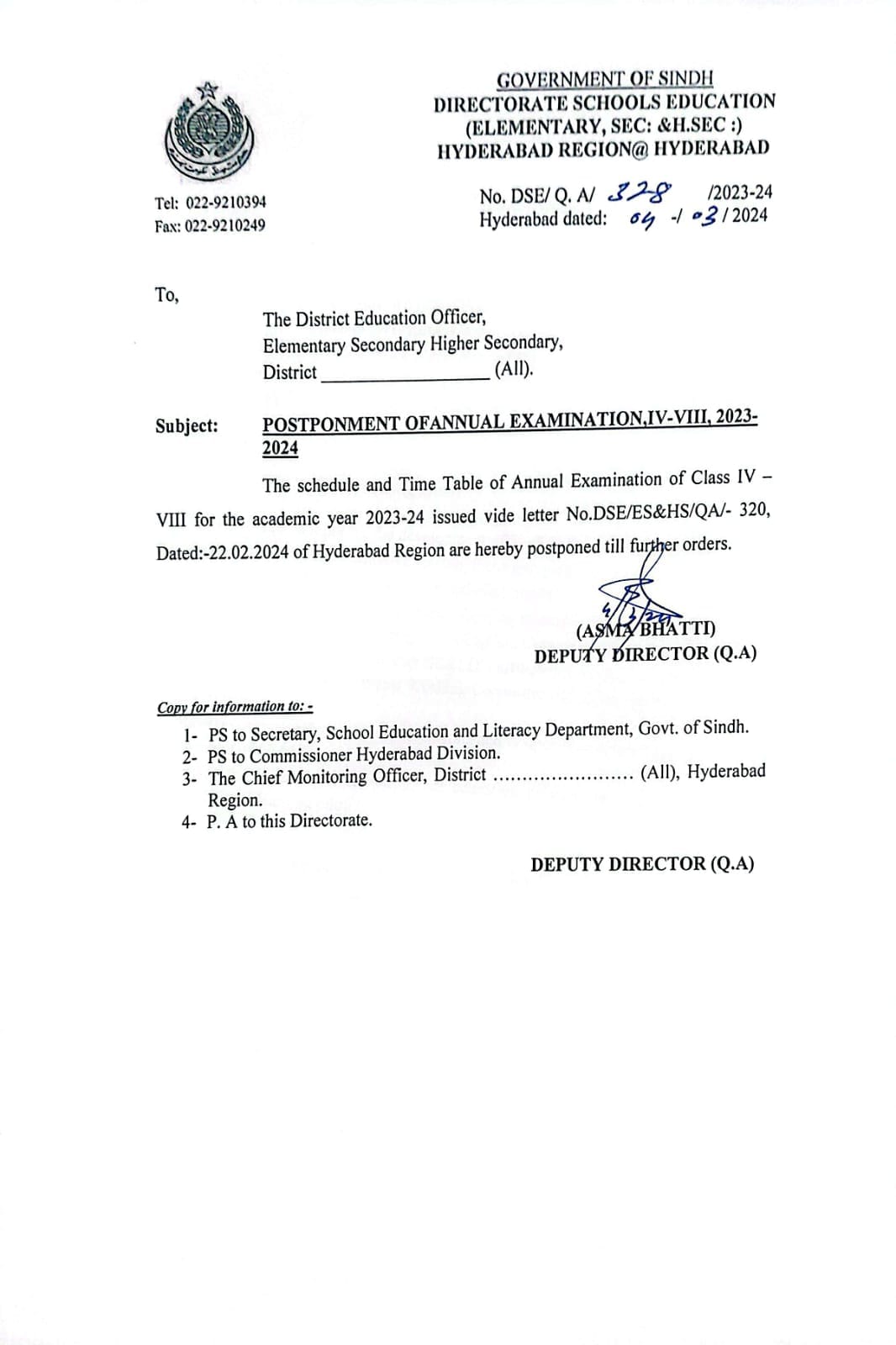 DSE Hyderabad 4th to 8th Annual Exams 2023-24 Postponement