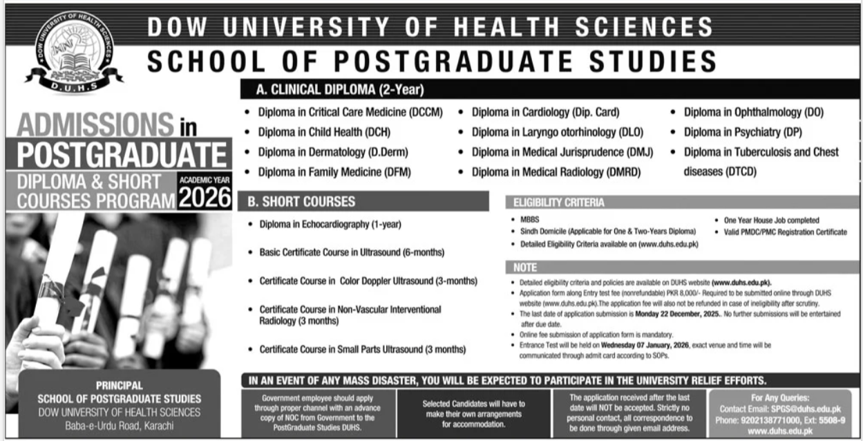 The Dow University of Health Sciences DUHS, Karachi—renowned for its excellence in medical education and clinical training—invites applications for the Postgraduate Diploma Programs 2-Year and Short Academic Year Courses for 2026. Offered through the School of Postgraduate Studies, these programs are designed to enhance clinical expertise and build advanced professional skills in healthcare practitioners across multiple specialties.
