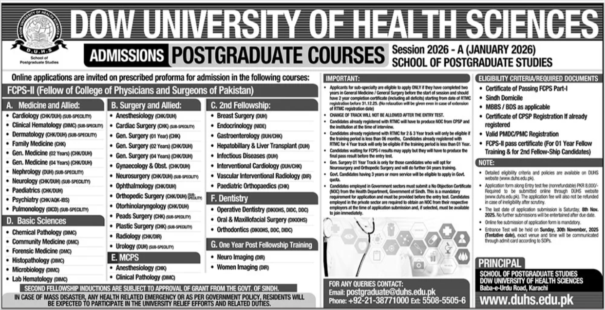 Dow University of Health Sciences DUHS, Karachi, invites online applications for Session 2026-A in its Postgraduate Programs offered through the School of Postgraduate Studies. Eligible candidates are encouraged to apply for FCPS-II, MCPS, 2nd Fellowship Programs, and One-Year Post-Fellowship Trainings in a wide range of disciplines across Medicine, Surgery, Dentistry, and Basic Sciences.