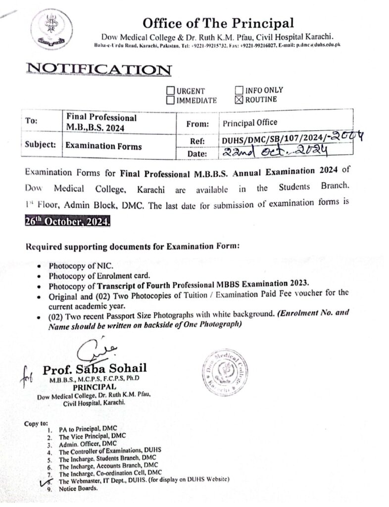 Dow University of Health Sciences DUHS has issued an important examination form submission notification for the Final Professional MBBS Annual Examination 2024. Students of Dow Medical College Karachi are advised that the examination forms are now available at the Students Branch.