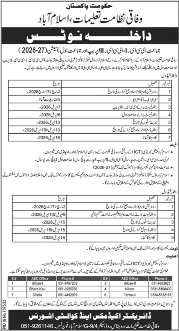 The Federal Directorate of Education FDE has officially announced the commencement of the admission process for the academic session 2026-27. This comprehensive rollout covers various levels, including ECE I-II, Prep, Class 1, and the Cambridge/Matric stream for Class 2 through Class 10. As a primary authority over Islamabad Model Schools and Colleges in urban and rural areas, the Federal Directorate of Education FDE is inviting parents to secure their children’s academic future by participating in the FDE Admissions 2026 cycle.