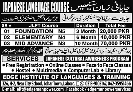Edge Institute of Languages & Training Lahore has offered admissions for Japanese Language Course. Male & Female both can apply. Admissions are open for session 2021.