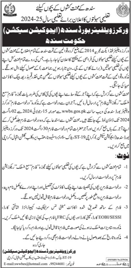 Apply Online 2024: Workers are requested to obtain and submit the application form along with the requisition form through their employers. The forms can be downloaded from the Workers Welfare Board Sindh website wwbs.gos.pk from 15 July 2024 to 02 August 2024. Completed forms should be submitted to the employer, who will then forward them to the Workers Welfare Board Sindh office by 30 August 2024.