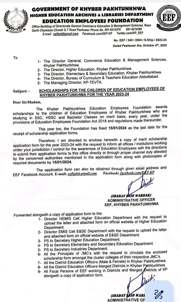 The Khyber Pakhtunkhwa Education Employees Foundation grants scholarships annually to deserving students on a merit basis. The scholarships are awarded under the provisions of the Education Employee Foundation Act 2018 and its regulations. The foundation has set January 15, 2024, as the deadline for the submission of scholarship application forms.