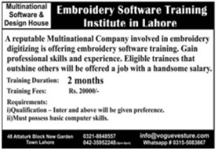 Multinational Software and Design House, Embroidery Software Training Institute has announced admissions in Embroidery Software Training in Lahore. Training duration is 2 months.