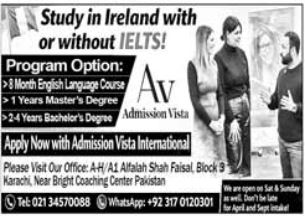 As international education remains a top priority for Pakistani students, Admission Vista International has officially launched its consultancy services for the admissions 2026 cycle, specifically targeting those looking to study in Ireland. Ireland has become an increasingly popular destination due to its high academic standards and post-study work opportunities. A standout feature of the current recruitment drive is the flexibility for students to apply with or without IELTS, lowering the barrier for entry into prestigious European institutions.