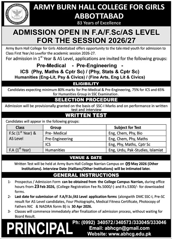 Army Burn Hall College for Girls Abbottabad has officially announced the opening of its prestigious intermediate and AS Level programs for the academic session 2026-27. With a legacy spanning 83 years of excellence, the institution continues to provide a transformative educational environment for the talented youth of Pakistan.