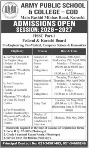 Army Public School & College COD Karachi has announced admissions for the academic session 2026–2027. Applications are invited for HSSC Part-I in multiple disciplines under both Federal Board and Karachi Board.