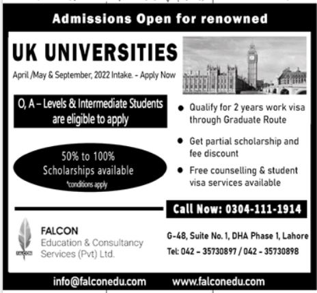 Falcon Education & Consultancy Services PVT Ltd Lahore is offering Admissions for Renowned UK Universities. Falcon Education & Consultancy Services PVT Ltd Lahore is an independent organization for the promotion of international education with special emphasis on student counselling and consultancy services. Students are strongly advised to consult education reference material available, and through interaction with acknowledged resource centers, and professionals, who have already studied or lived abroad. Students passed O, A-Level and Intermediate are eligible to apply for April / May and September 2022 Intake. Qualified candidates can avail 2 Years work visa through Graduate Route. Scholarships are available. Candidates can apply now.