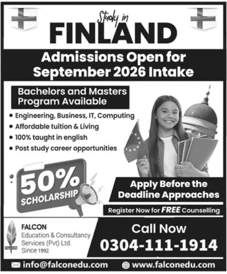 Students applying through Falcons Admissions for Finland Bachelor & Master Programs 2026 can also benefit from a 50% scholarship option, helping them reduce their study expenses significantly. Falcon is also offering FREE counselling for interested candidates, ensuring full support from university selection to application submission. Since 1992, Falcon has been helping students achieve international education goals, and now is the perfect time to register before deadlines get closer.