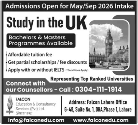 Falcon Education & Consultancy Services Pvt Ltd, Lahore has officially announced Falcons Admissions 2026, inviting students to pursue higher education in the UK. With options for Bachelors & Masters Programmes, Falcon ensures students can achieve their international study goals with ease.