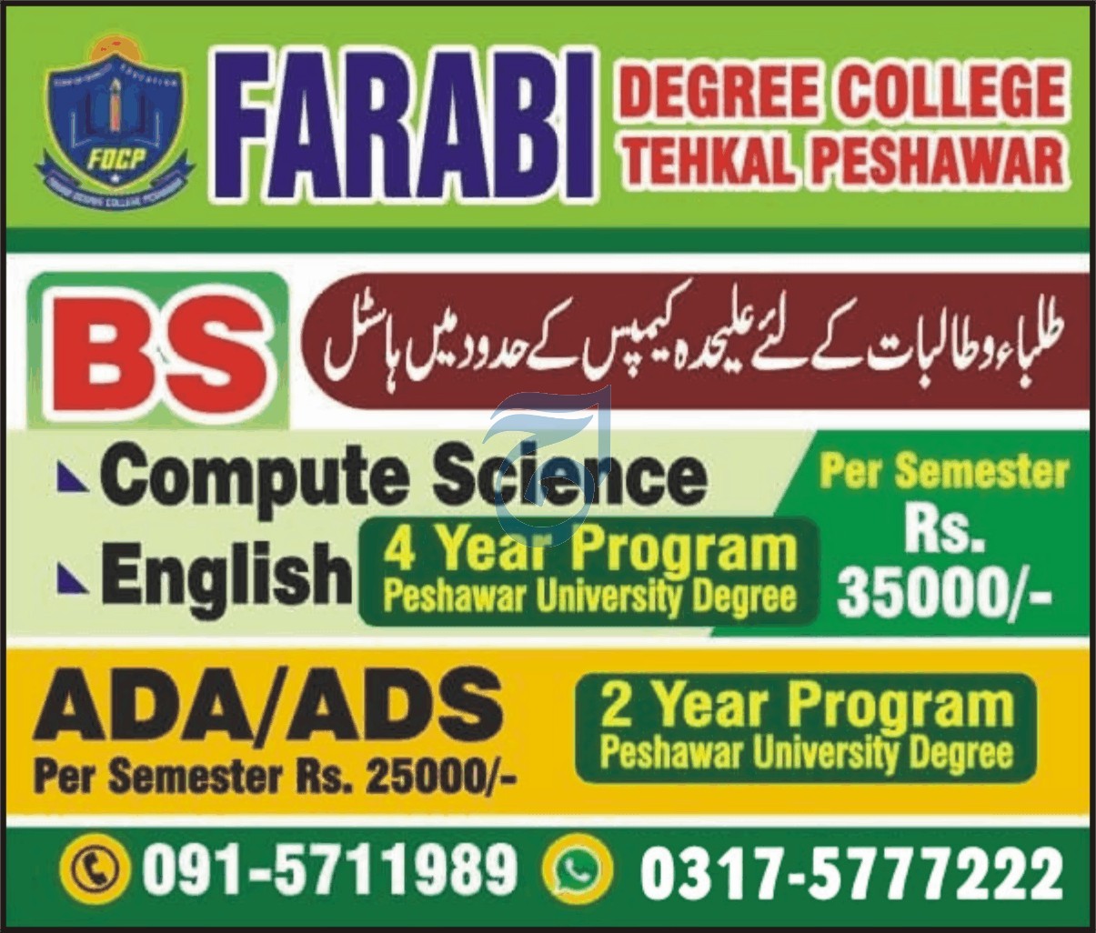 Farabi Degree College Tehkal Peshawar proudly announces admissions open for students seeking quality education in a disciplined and resourceful academic environment. With separate campuses for male and female students, the college ensures a comfortable and secure setting where learners can thrive and achieve their academic goals with confidence.