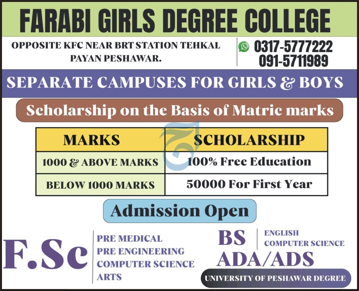 Farabi Girls Degree College, located in the heart of Peshawar, is now accepting admissions for the upcoming academic session. With separate campuses for girls and boys, the college offers a secure and academically enriching environment to help students succeed in both intermediate and degree-level programs.