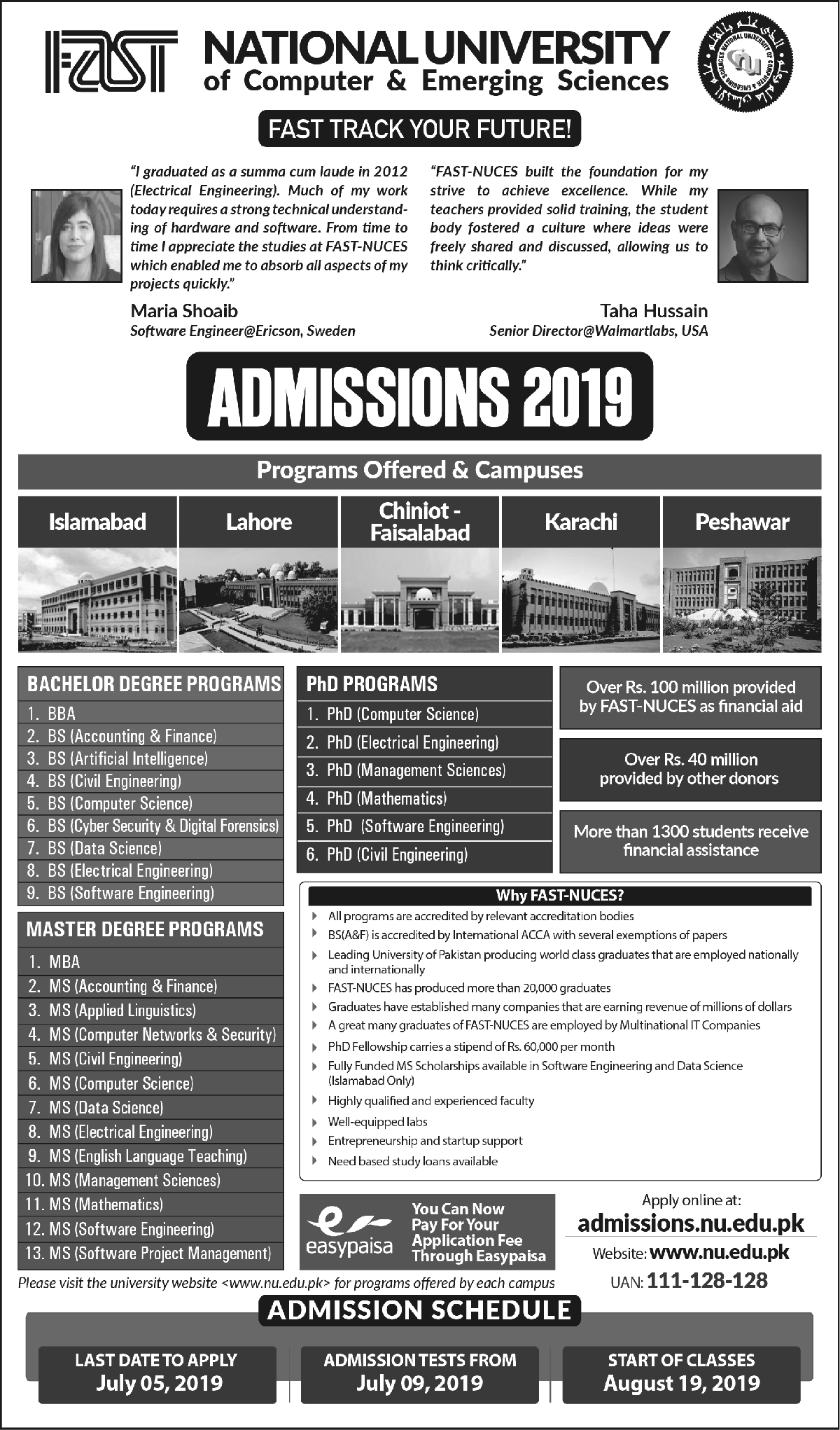 National University of Computer and Emerging Science offer admissions in various subjects. NUCES announced admissions in BBA, BS, MS, MBA and Phd. last date to apply for admissions is July 05 2019.