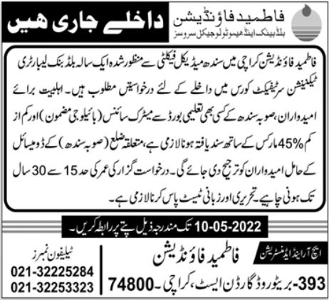 Fatimid Foundation Karachi is started the procedure for granting Fatimid Foundation Admissions 2022 accepting applications from desirous candidates for granting Fatimid Foundation Karachi Course Admissions 2022 for Session 2022. Fatimid Foundation Course Admissions 2022 are announced in 1 Year Blood Bank Laboratory Technician Certificate Course. Candidates should pass Matric Exam with Bio Science with minimum 45% marks for apply on Fatimid Foundation Blood Bank Laboratory Technician Course Admissions 2022. Candidates must passed written and Oral Test that will by conducted by Fatimid. Fatimid Foundation Karachi Blood Bank Laboratory Technician Course Admissions 2022 are open now.