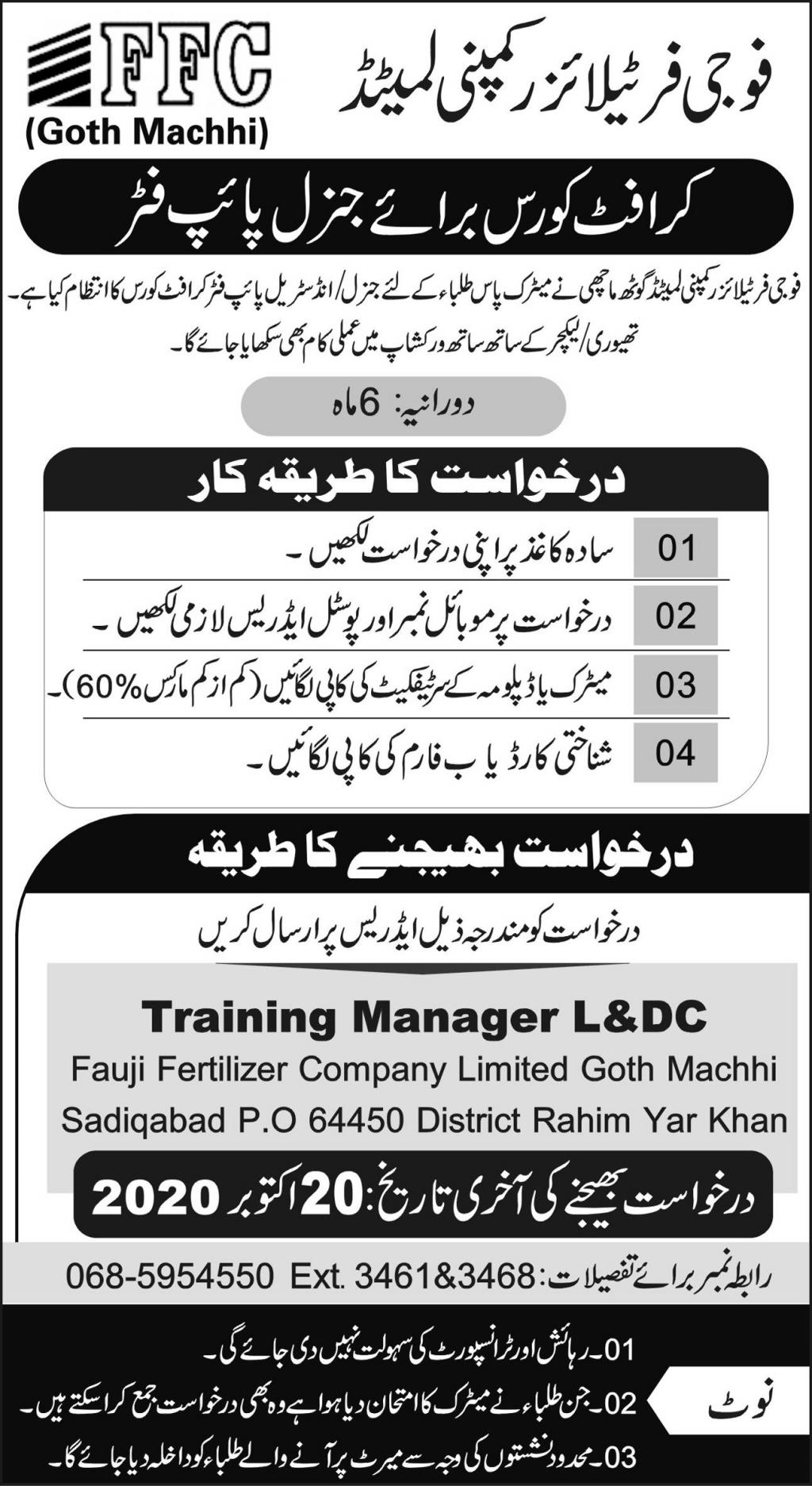 Fauji Fertilizer Company Limited has announced admissions 2020 for Craft Course for General Pipe Fitter, Industrial Pipe Fitter Craft Course in Rahim Yar Khan.