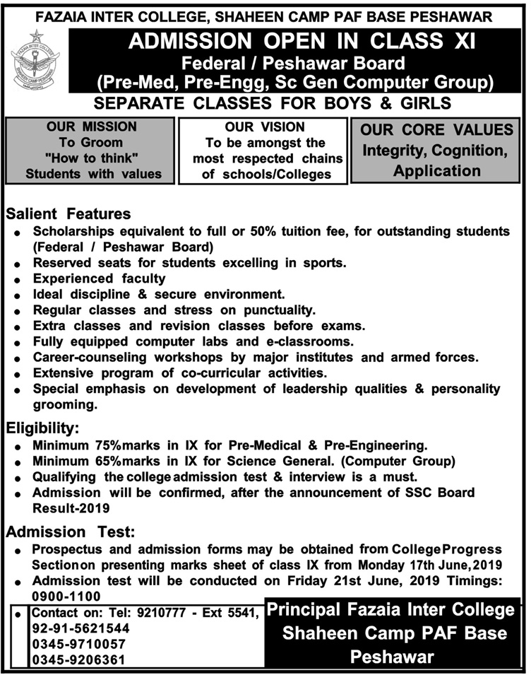 Peshawar, Fazaia Inter College, Shaheen Camp PAF Base Peshawar has offered admissions in Class 11th. Admissions for Pre-Medical, Pre-Engg, Science General, Computer. last date to apply for admission is 17th june 2019,