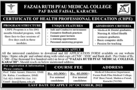 Fazaia Ruth PFAU Medical College PFAU Base Faisal Karachi has announced admission for the year 2022. Fazaia Ruth PFAU Medical College is offering admission in six month certificate of Health Professional Education. Those student who want to take admission in ChPE certificate can visit the appropriate branch for further information as soon as feasible, submit a form before the admission closes. Last date of submission of application is Oct 31, 2022. This institution is offering the highest level of education.